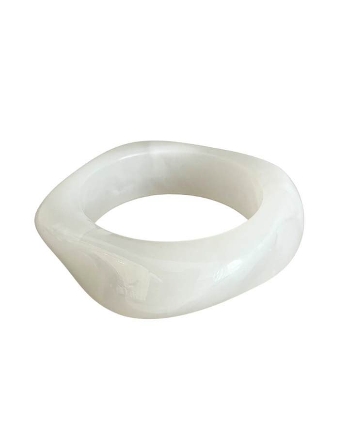 Resin bangle in a White Clear color with an assymetrical shape. Perfect for a casual outfit or a more dressed-up touch.