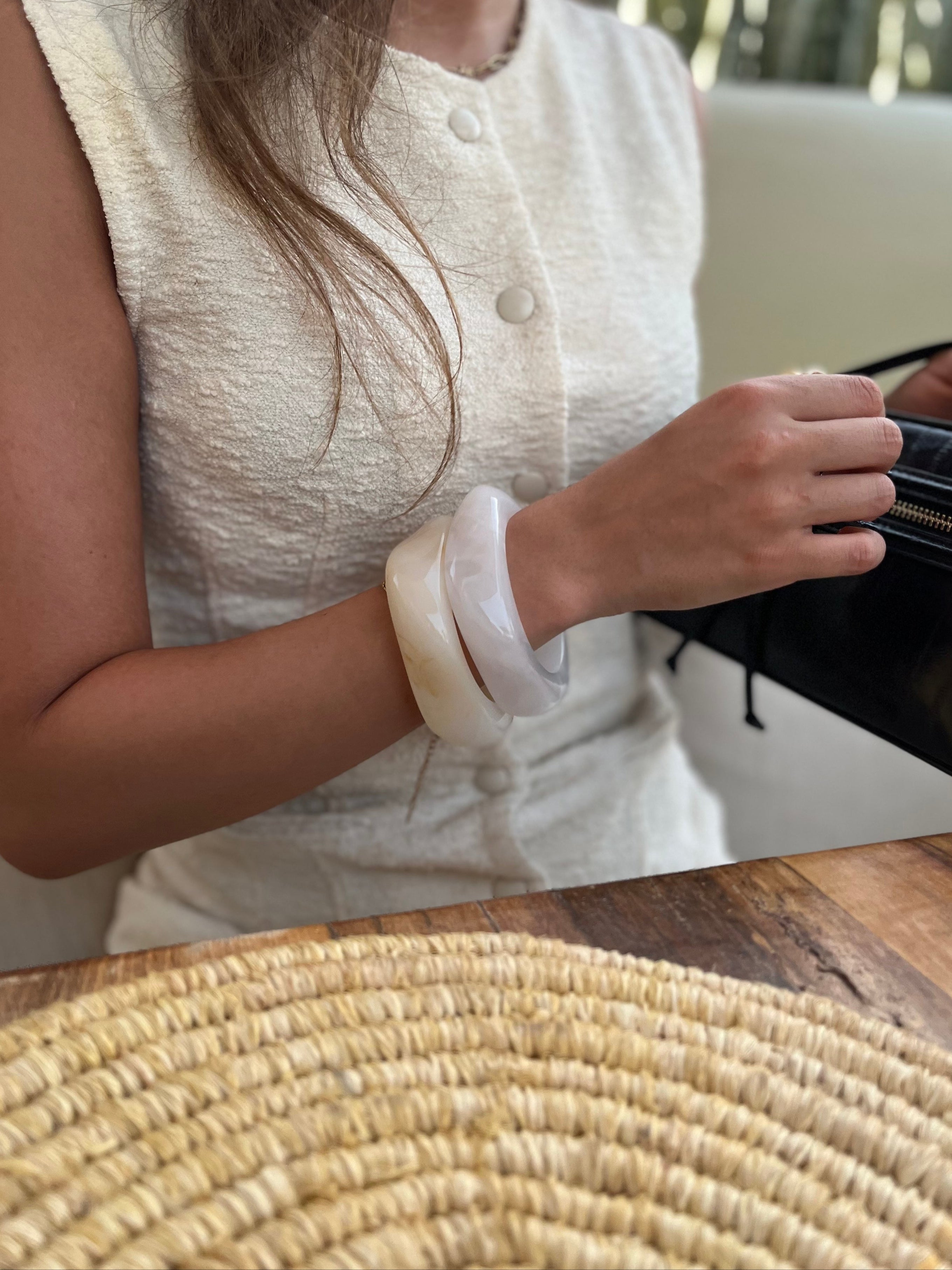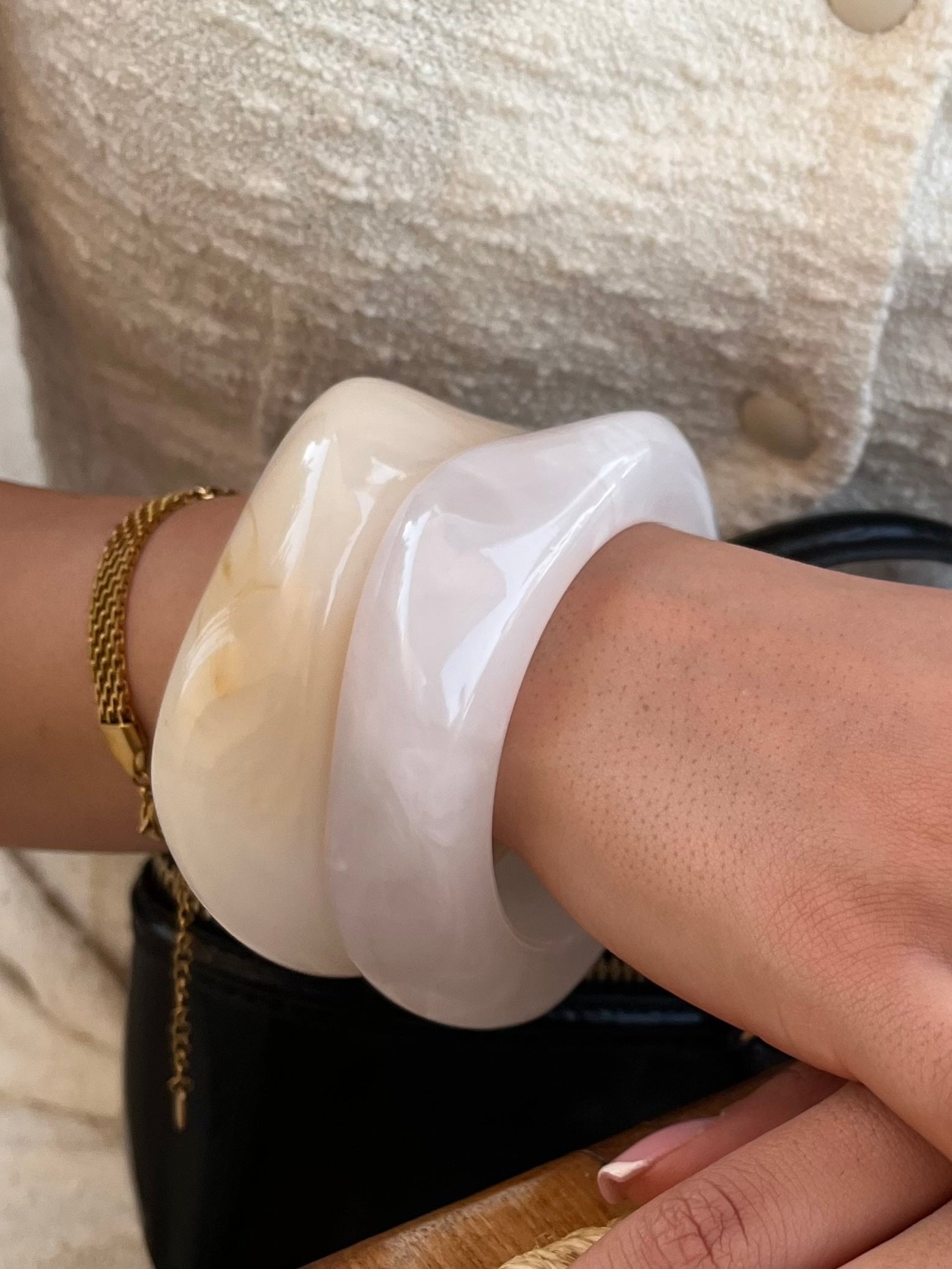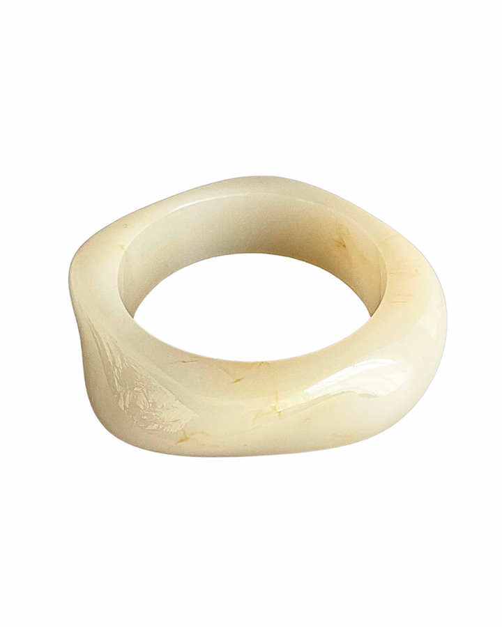 Resin bangle in a Cream Clear color with an assymetrical shape. Perfect for a casual outfit or a more dressed-up touch.
