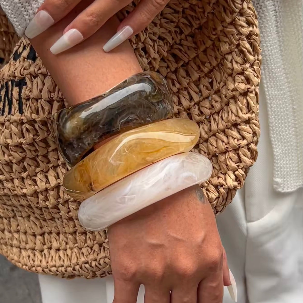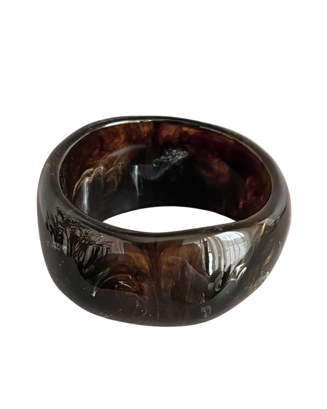 Resin bangle in a Brown Mixed Clear color with an assymetrical shape. Perfect for a casual outfit or a more dressed-up touch.